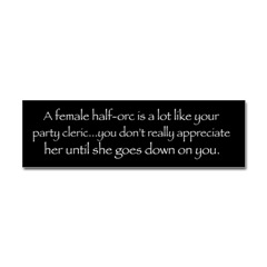 A female half-orc bumperstickerProduct DetailsTell the world how you feel! Our bumper stickers are perfect for expressing yourself while cruising down the highway or just for posting on the wall.