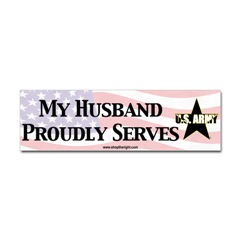 Army Husband Proudly Serves BumperstickerFrom the Designer Tell the world how you feel! Our bumper stickers are perfect for expressing yourself while cruising down the highway or just for posting on the wall.
