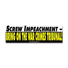 Bring on the War Crimes Tribunal BumperstickerFrom the Designer Tell the world how you feel! Our bumper stickers are perfect for expressing yourself while cruising down the highway or just for posting on the wall.