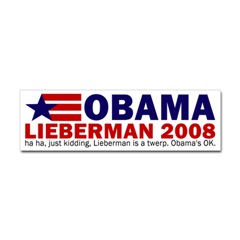 Obama-Lieberman 2008 bumper stickerFrom the Designer Tell the world how you feel! Our bumper stickers are perfect for expressing yourself while cruising down the highway or just for posting on the wall.